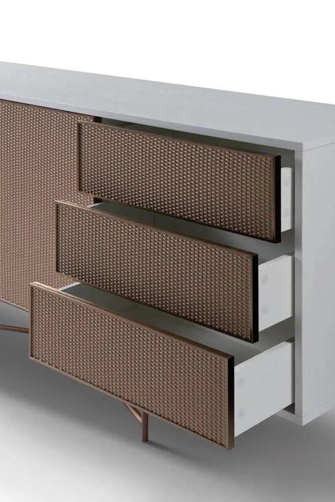 The Adriana White Oak & Rattan Sideboard Buffet is the perfect choice for those seeking both versatility and modern charm. This stunning buffet features a white matt oak veneer frame paired with natural-coloured synthetic rattan doors and drawers, all beautifully supported by bronze metal legs for a chic, contemporary finish.