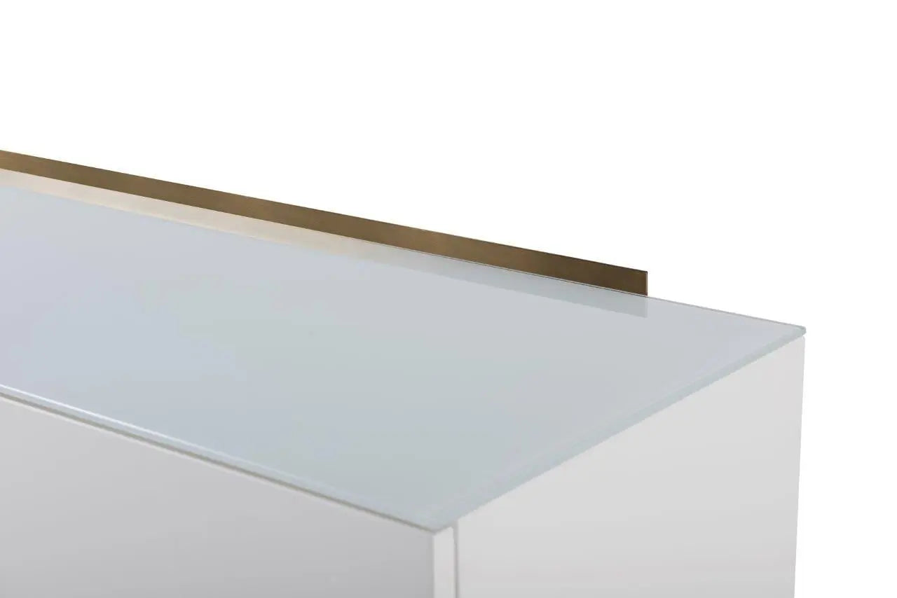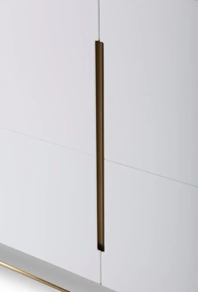 The Alberto Four Door White & Gold Sideboard is a beautifully crafted statement piece, designed with sleek edges and crisp modern lines. Its pristine white lacquered finish is elegantly complemented by a golden frame and refined metallic accents, creating a luxurious focal point in any room.