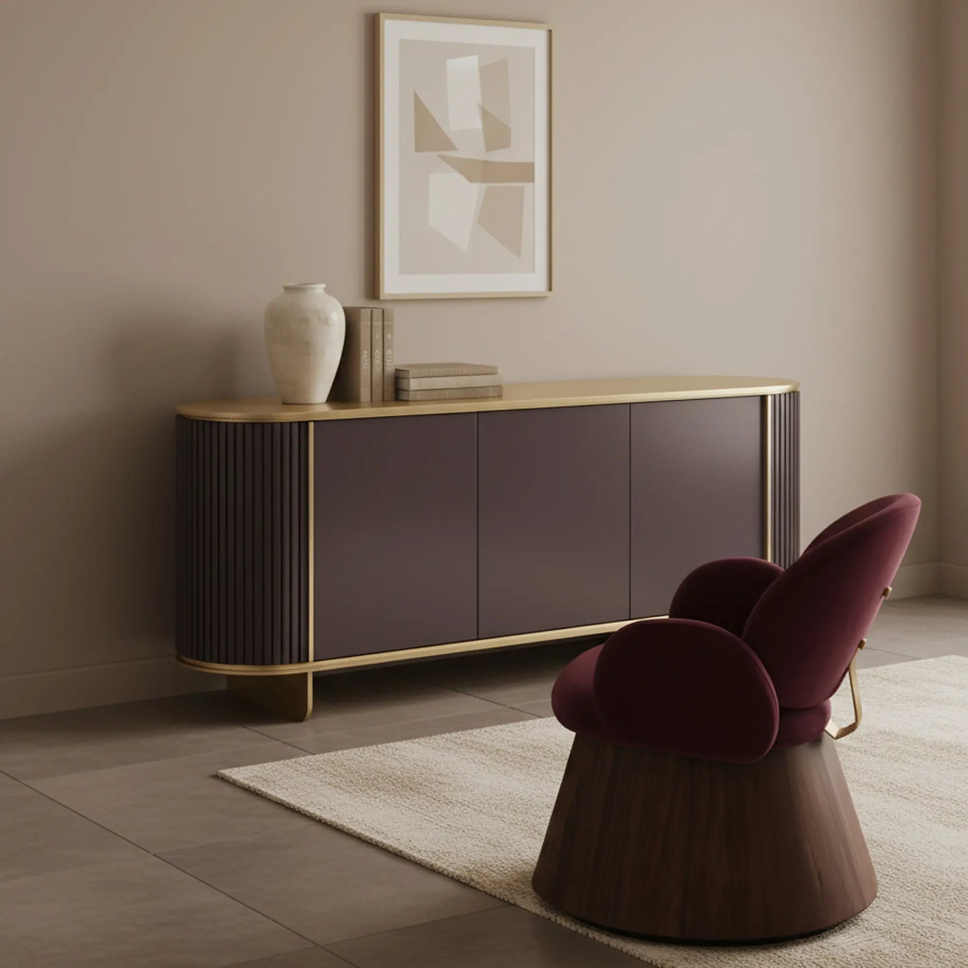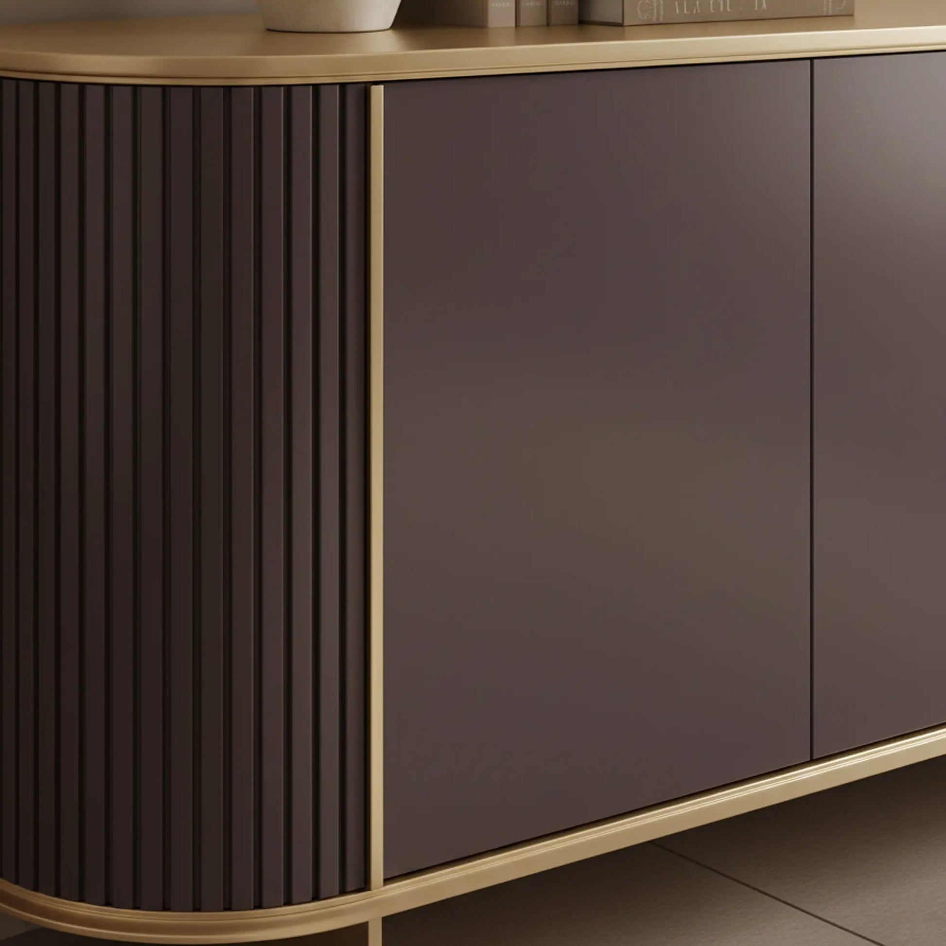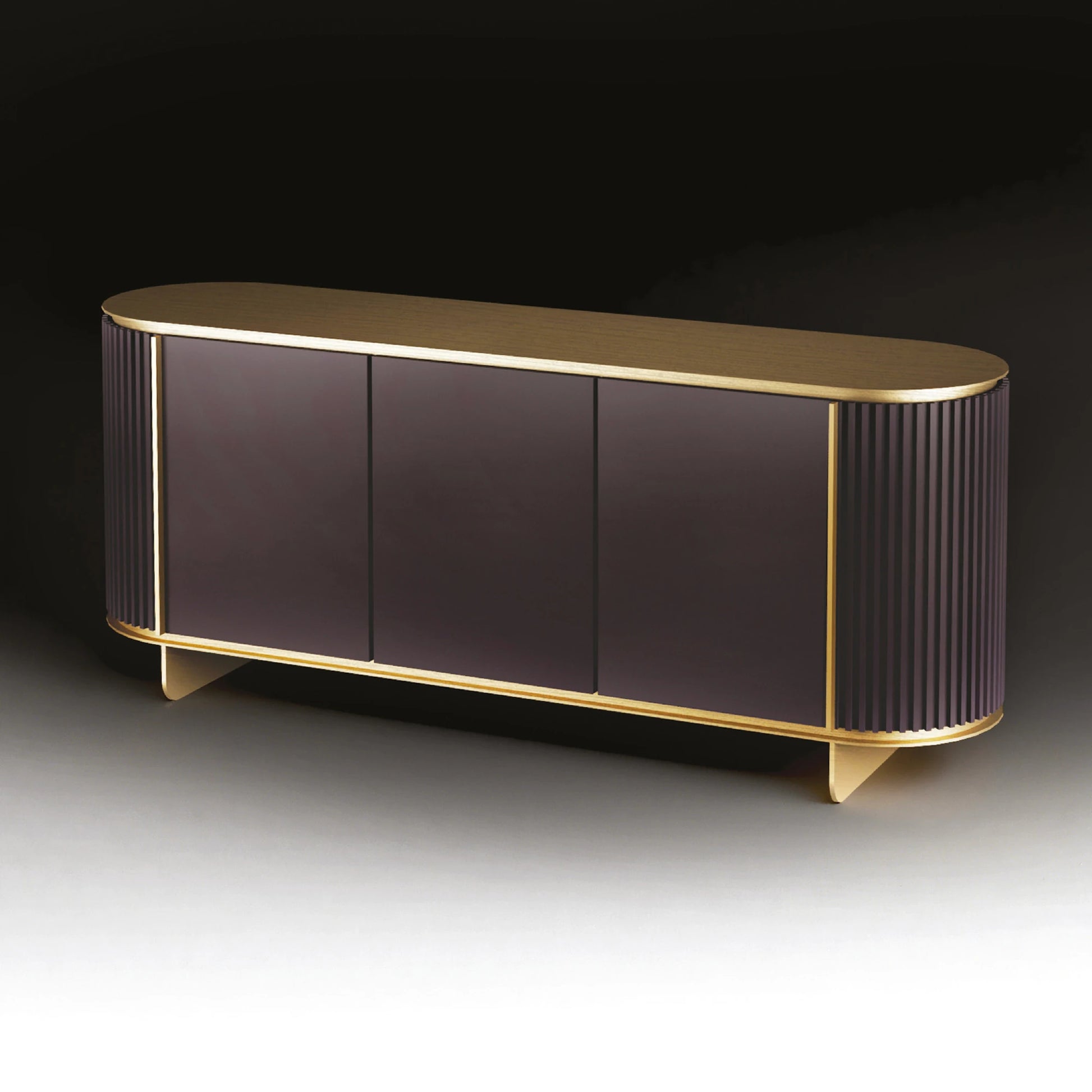 Its sculptural, rounded wooden structure features subtle ribbed detailing and a flawless lacquered finish, gracefully supported by a minimalist steel base and profiles in a lustrous brass finish. Concealed soft-close hinges and internal shelving ensure both elegance and practicality.