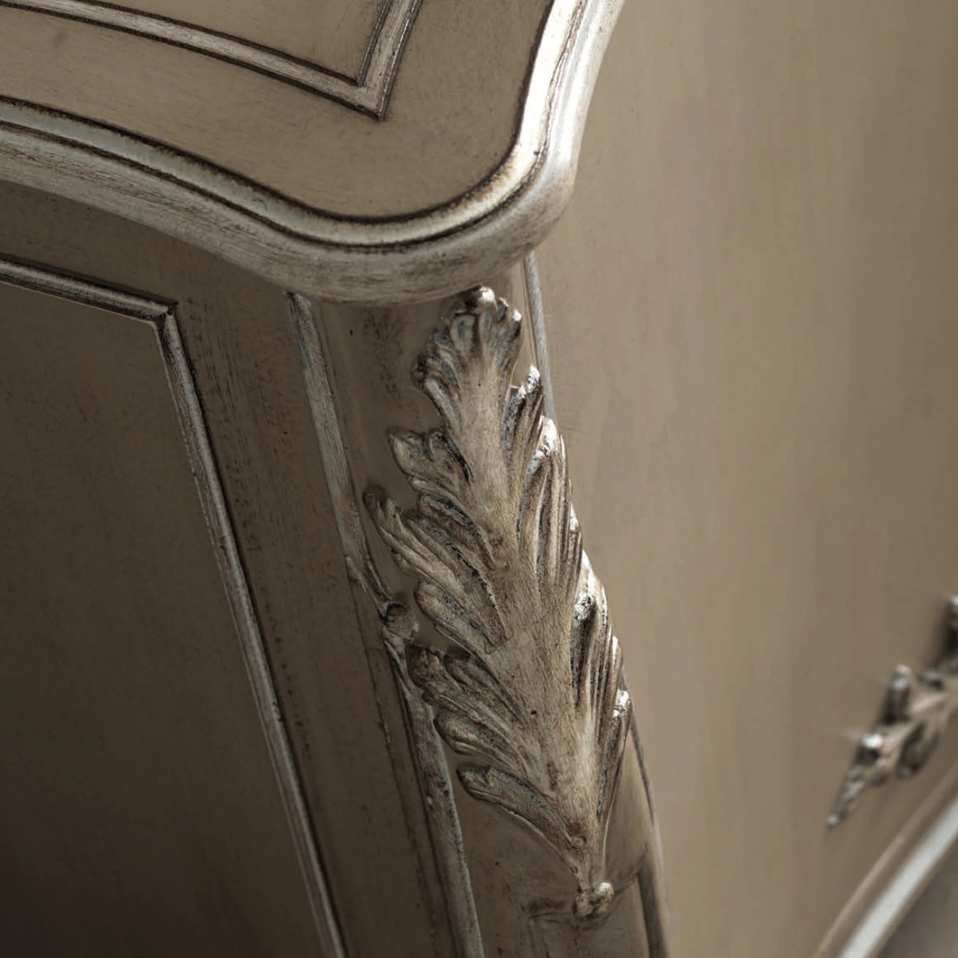Graceful concave curves, intricately carved botanical motifs, and exquisite handles showcase exceptional craftsmanship. Finished in antique ecru with hand-painted white and silver accents, it radiates vintage charm and romantic allure. An internal shelf provides functional storage, completing its blend of beauty and utility.