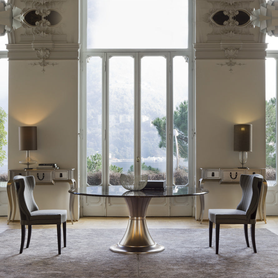 A precious rich brown Spanish marble forms the stunning circular top, complete with a matching revolving server for the ultimate in refined functionality. The contemporary solid wood base is finished in a distinctive champagne chrome effect, offering a softer, more nuanced alternative to traditional metal. This design is equally striking in alternative marbles or with a hand-crafted contemporary cement top, available upon request.