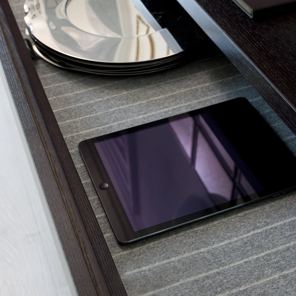 Exuding sophistication and elegance, this Italian Marble Topped Contemporary Sideboard is a true statement piece. The luxurious Italian marble top features striking white and gold veining, perfectly complementing the curved, scalloped structure in mocha ash wood. A beautifully upholstered central drawer, complete with matching handles, adds a tactile element of refinement and is lined with cashmere for a sumptuous touch. The drawer can also be offered in a lacquered finish—customisable to suit your style. Prices vary depending on finish.
