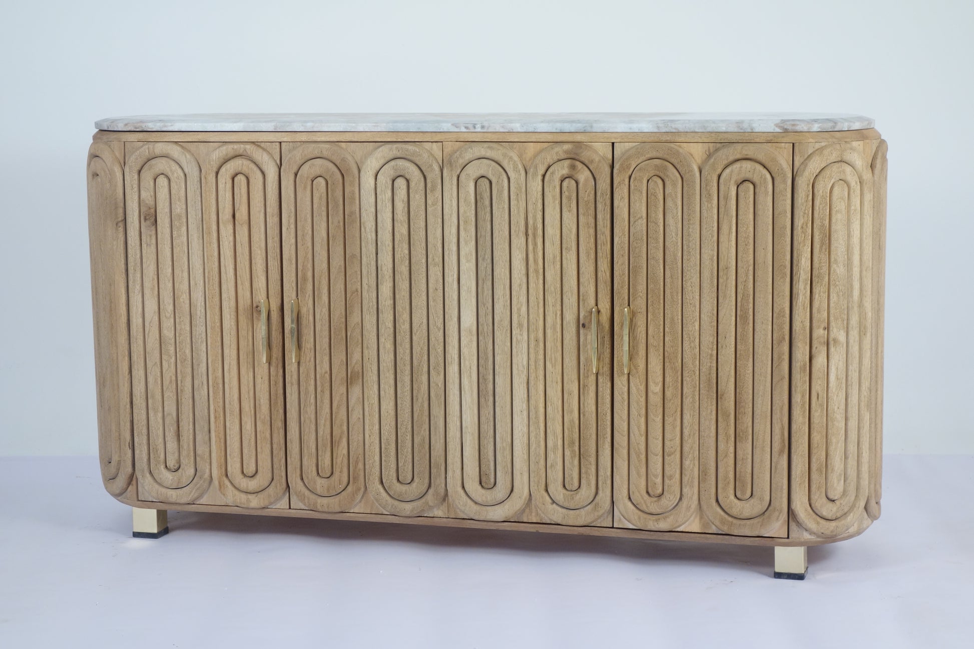The Kasli Sideboard is crafted from solid mango wood and features a smooth, capsule-shaped silhouette topped with luxurious marble. Its gently curved form and natural textures create a modern yet organic aesthetic, making it a striking addition to any room. Behind its clean, minimalist doors lies generous storage—perfect for keeping living, dining, or commercial spaces effortlessly organised and stylish.