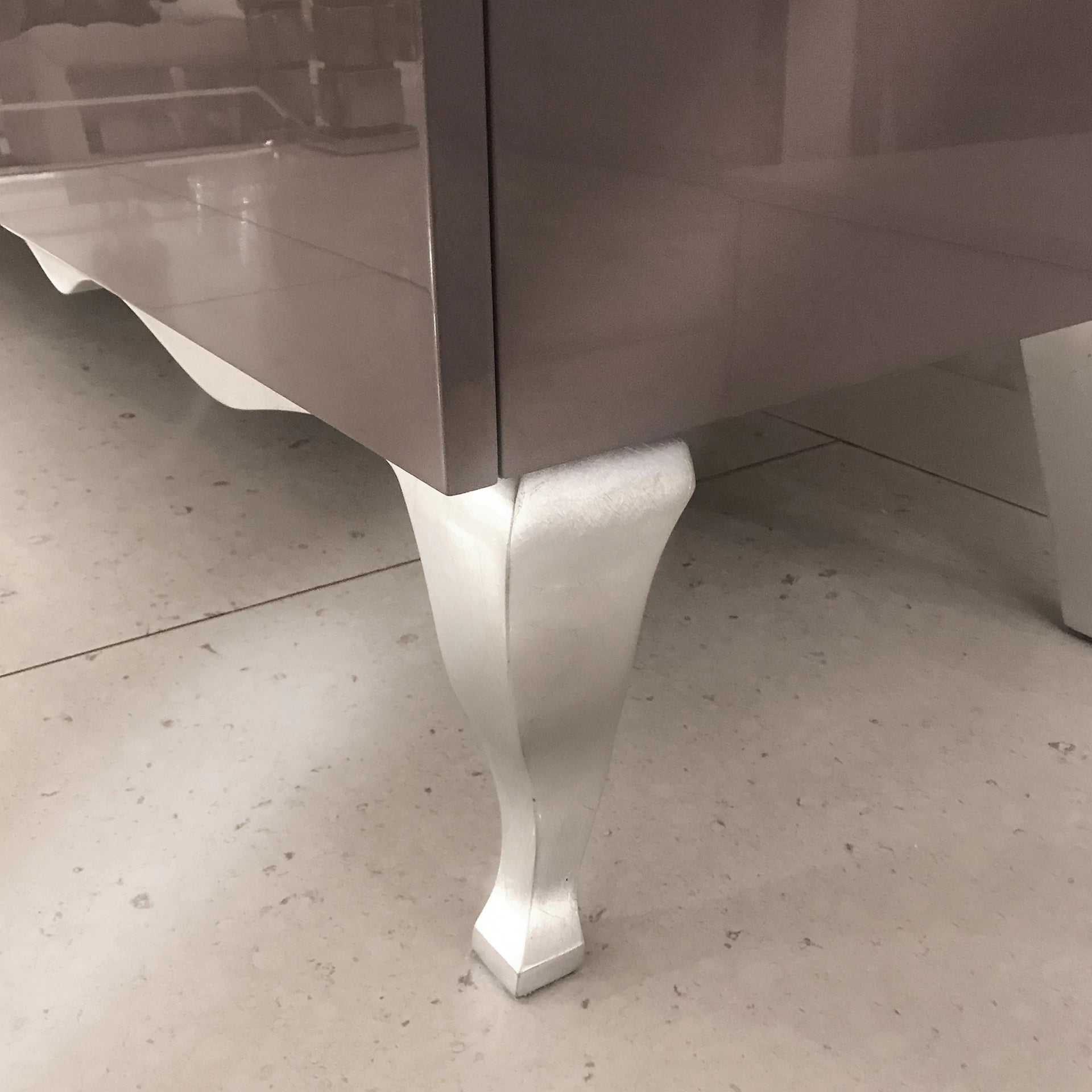 The striking wooden structure is supported by a robust steel frame and finished in an exquisite high-gloss taupe lacquer, meticulously hand-decorated by skilled Italian artisans. This exceptional sideboard features four generous doors, opening to reveal two central compartments each fitted with an internal glass shelf for functional yet refined storage.