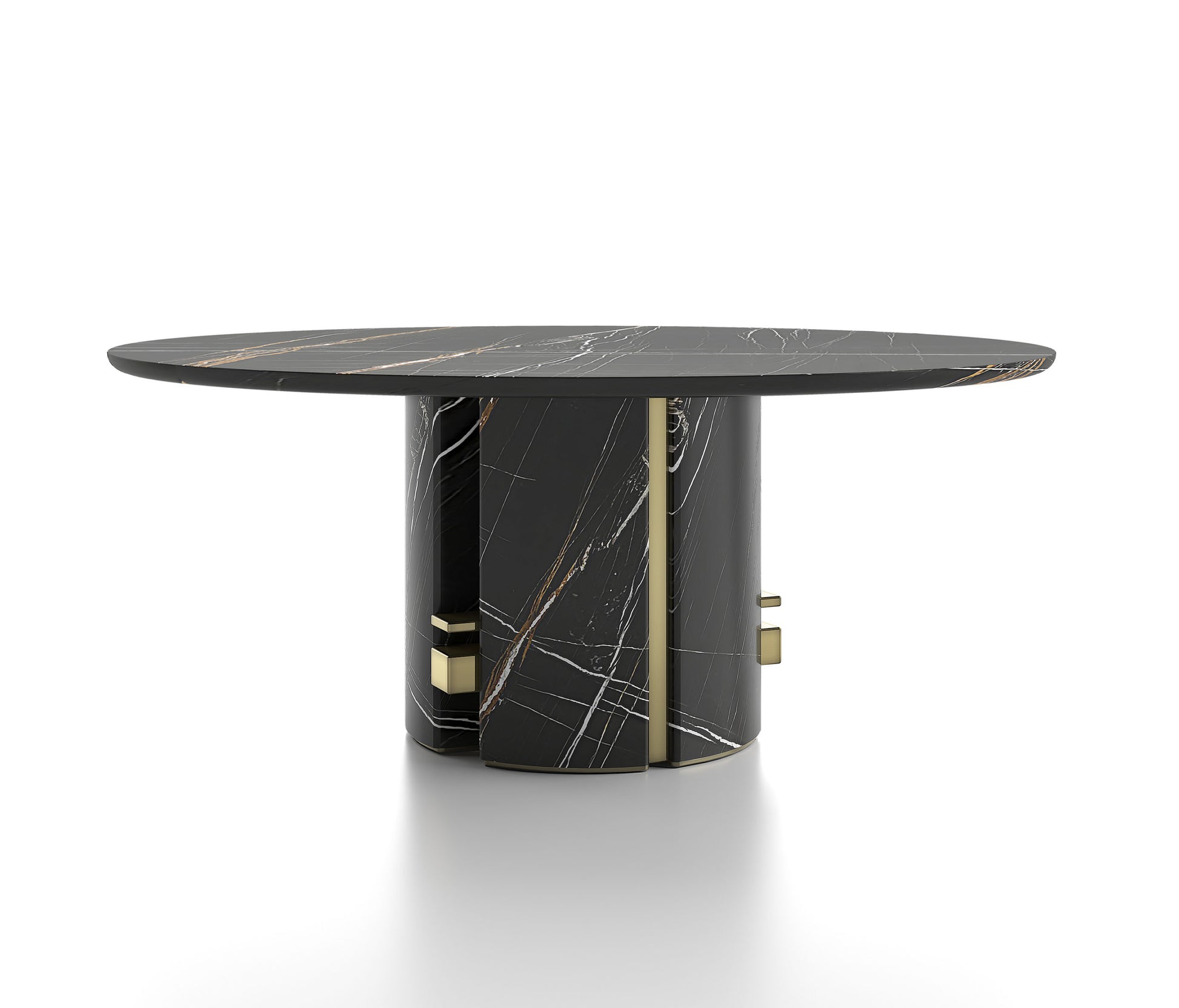 Expertly handcrafted by master Italian artisans, this remarkable dining table combines the natural beauty of marble with elegant metal design elements in a matte gold finish. The circular marble top is beautifully inset and supported by a sophisticated base, showcasing the perfect balance of form and function.