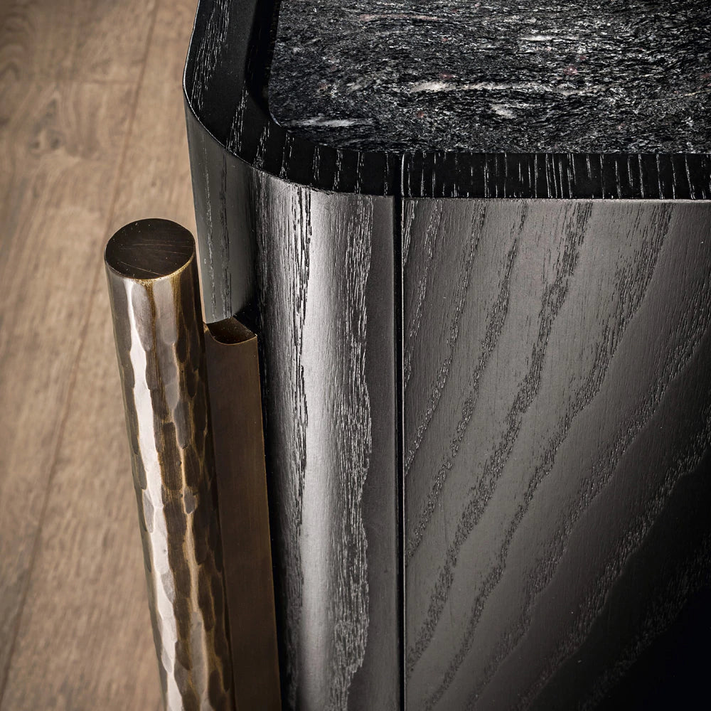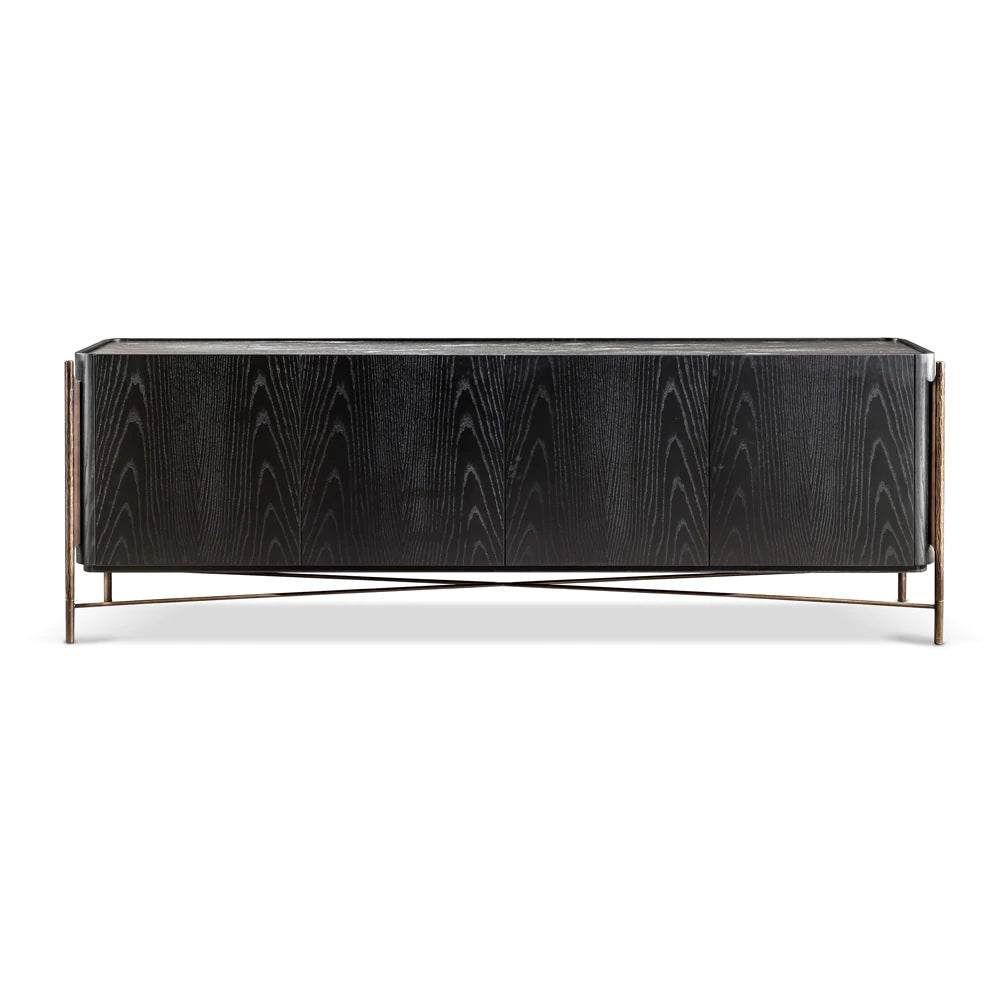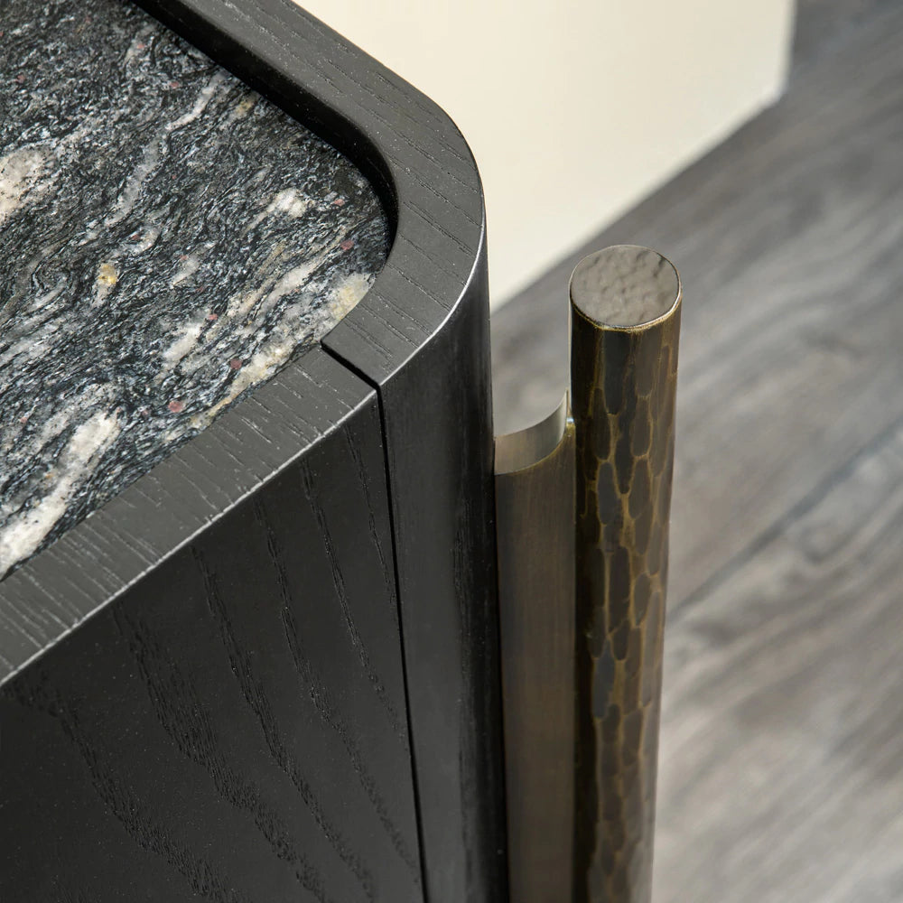 Crafted from elegant Black Ash, the sleek structure features gently rounded edges and a dramatic inset Brushed Black Cosmic Marble top that adds depth and visual contrast. The façade is composed of four seamless doors, each equipped with a soft-close mechanism for smooth, effortless operation. Raised door fronts act as discreet integrated handles, enhancing the sideboard’s minimalist aesthetic.