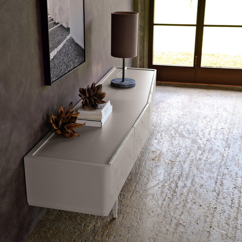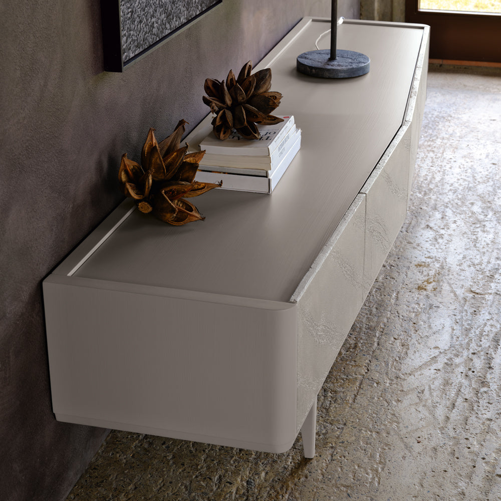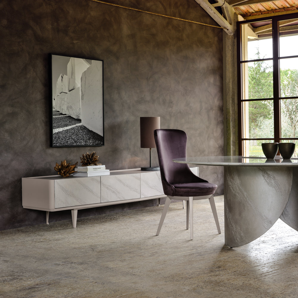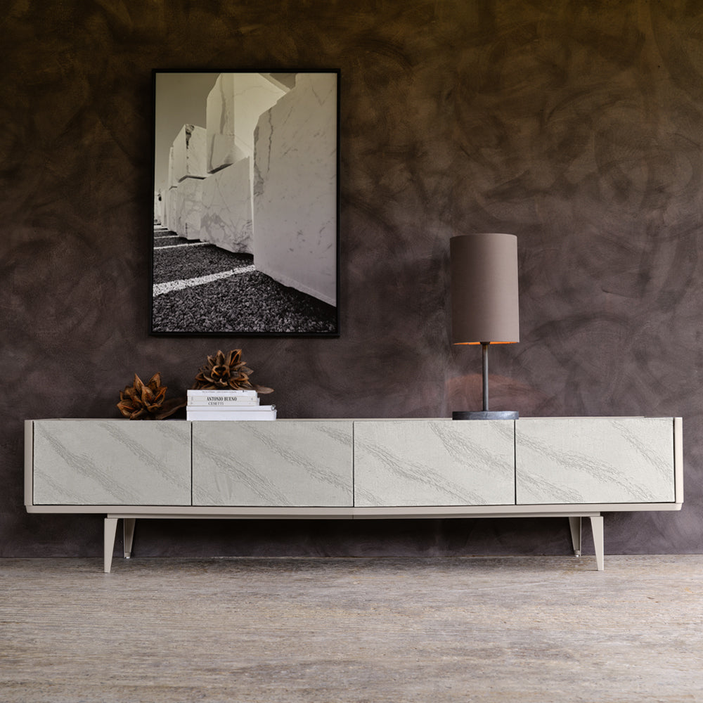 Expertly crafted with a wooden structure in a natural painted finish, this sideboard features four Blumotion drawers for smooth, effortless functionality and generous storage capacity. The drawer fronts in a striking silver rock finish add a distinctive focal point, beautifully complemented by a lacquered metal base and legs that enhance its modern silhouette.