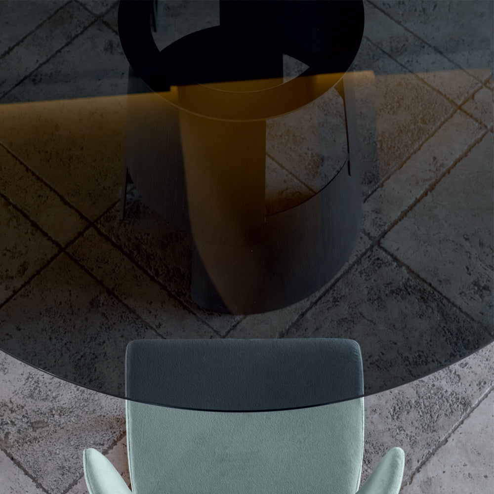 Top: Round smoked glass supported by an electro-welded steel plate