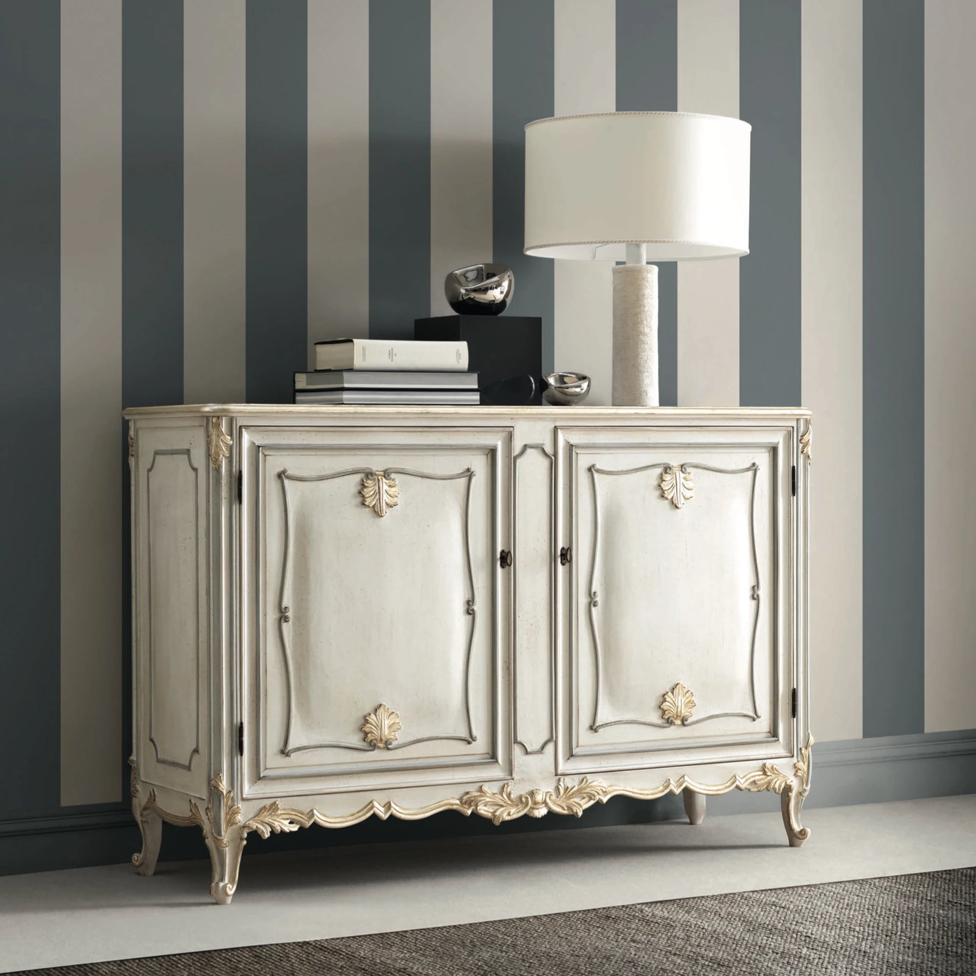 Showcasing elegant lines and intricate hand-carved details, the sideboard features symmetrical botanical motifs complemented by exquisite lock-and-key accents. Its distinctive satined two-tone grey finish is delicately enriched with hand-painted silver highlights, creating a soft vintage patina that exudes understated luxury.